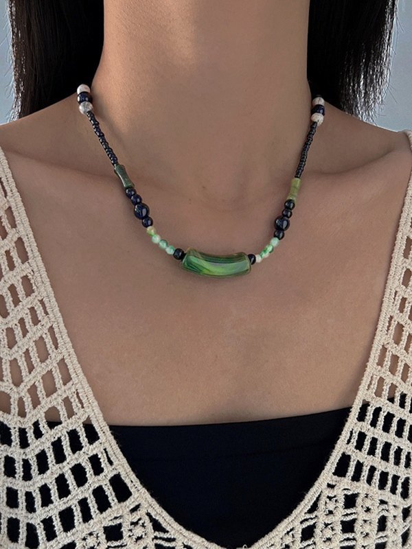 Wooden Disc Pendant Irregular Black Crystal Beaded Necklace