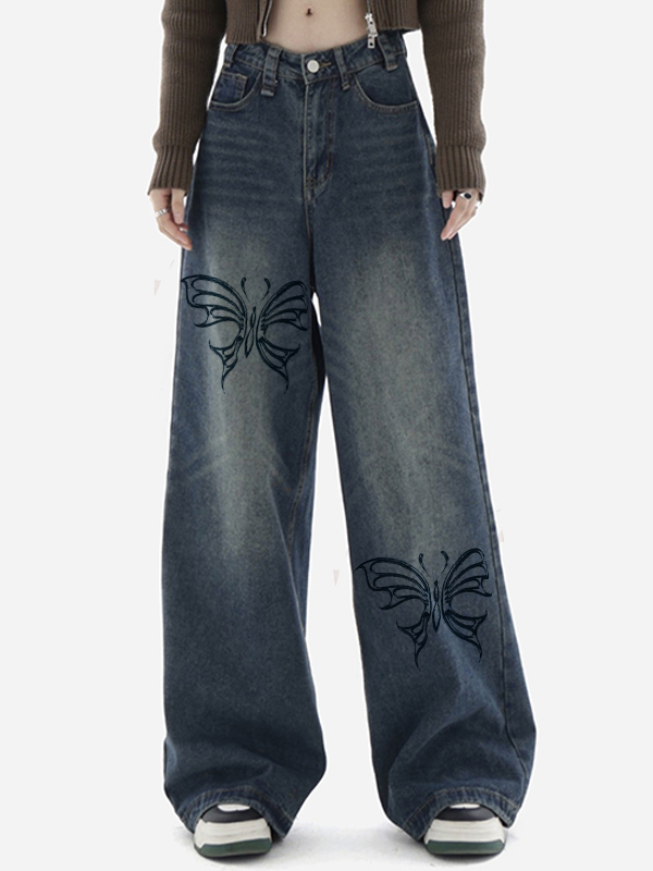Butterfly Print Blue Wash Baggy Boyfriend Jeans