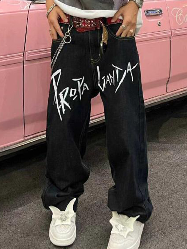 Spider Print Vintage Blue Wide Leg Boyfriend Jeans