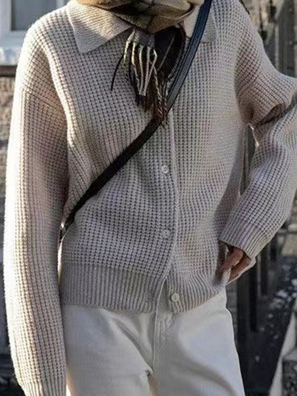 Solid Waffle Lapel Neck Cardigan