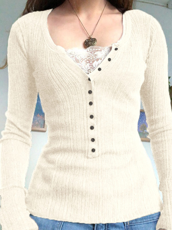 Solid Color Lace Stitching Slim Fit Long Sleeve Knits