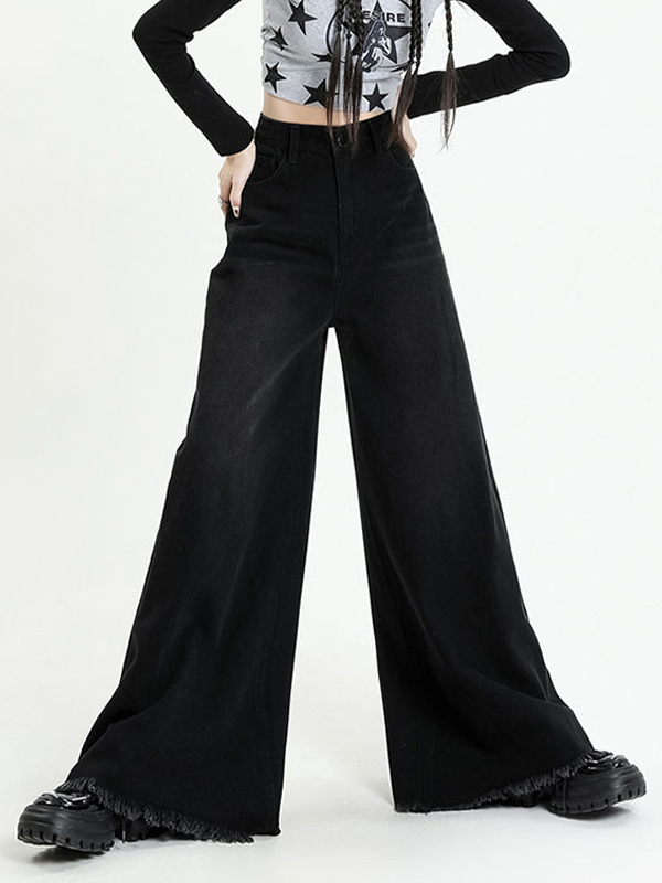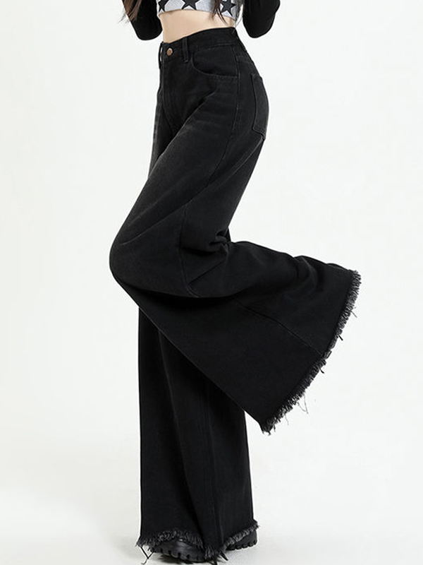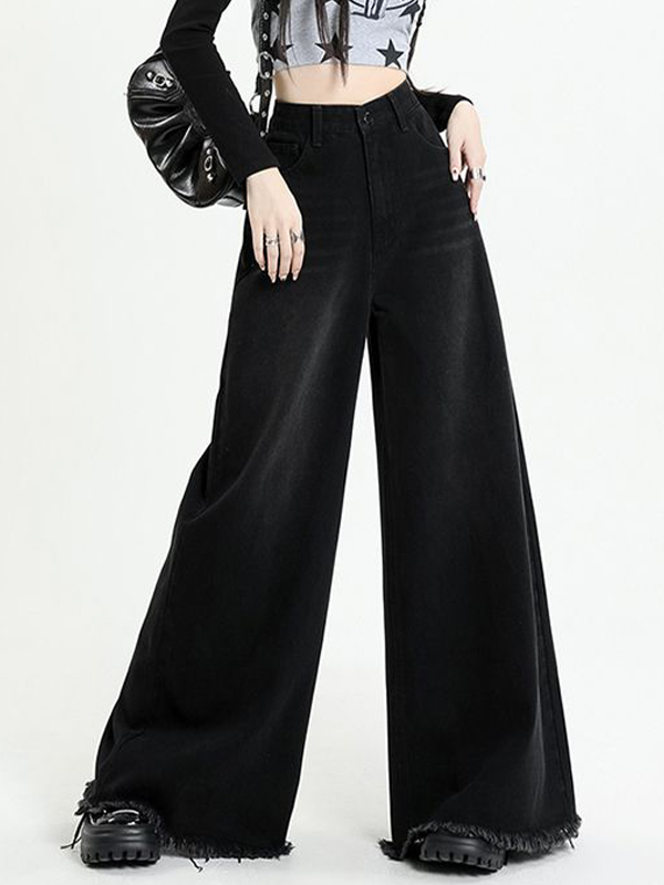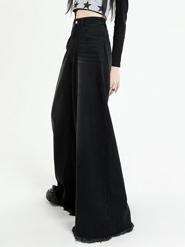 Versatile Black Raw Edge Wide Leg Boyfriend Jeans