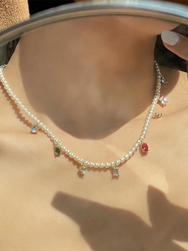 Zircon Pendant Faux Pearl Necklace