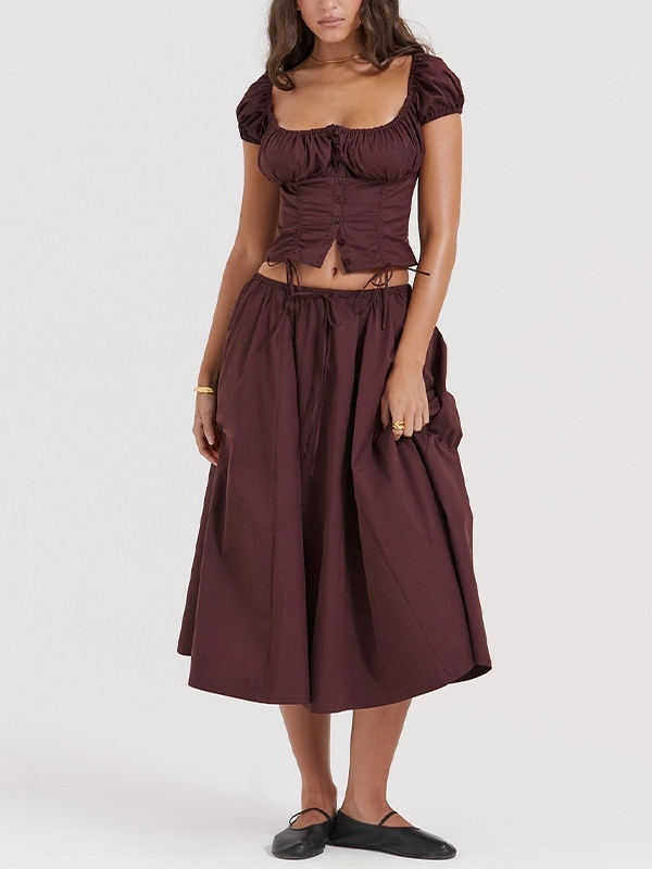 Solid Drawstring Puff Sleeve Cropped Tee&Midi Skirt Set